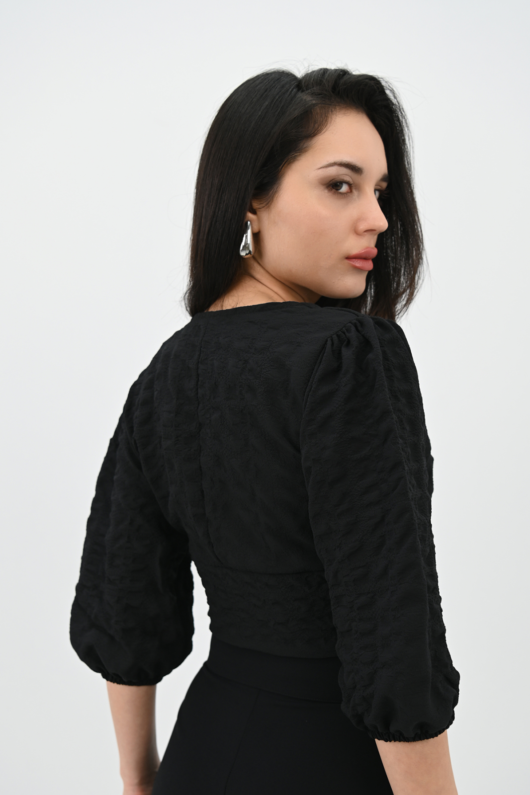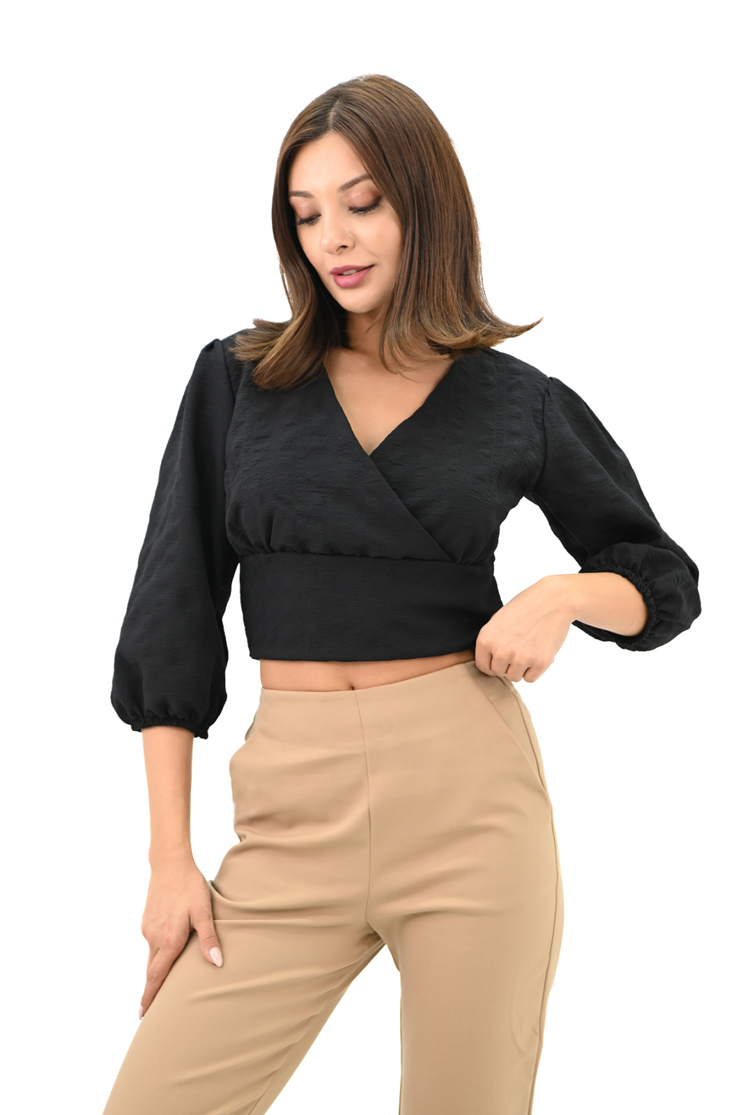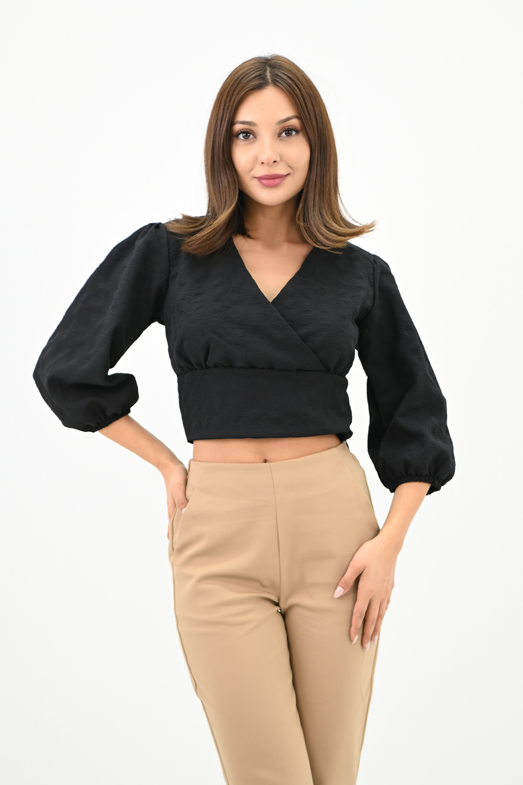 Bluza casual, maneca trei sferturi, model scurt crop-top, Negru