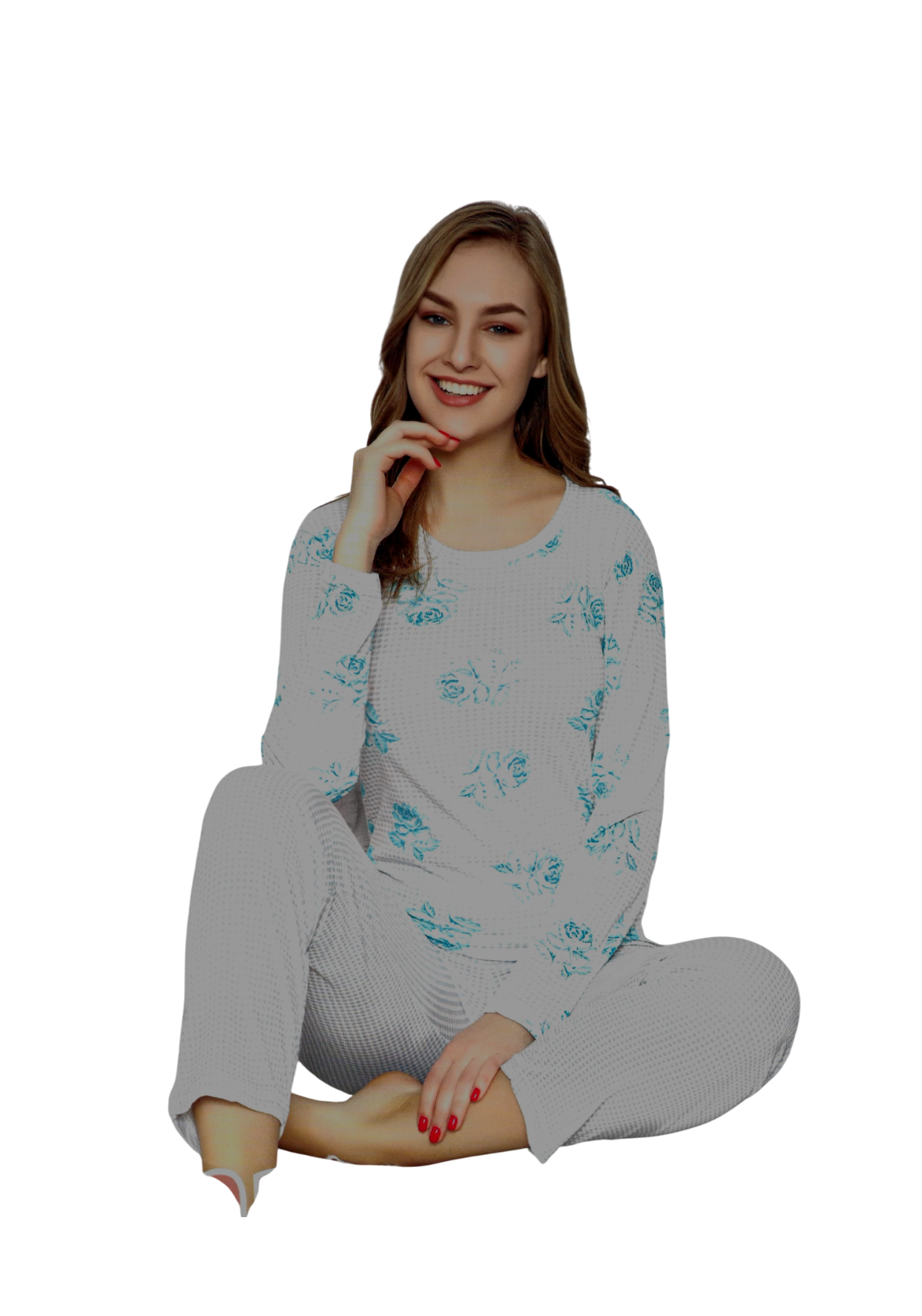 Acest set de pijamale pentru femei combina confortul si stilul intr-un mod desavarsit. Compus dintr-o bluza cu maneca lunga si pantaloni lungi, cu un decolteu rotund care completeaza aspectul relaxat. Manecile lejere fara mansete elastice asigura libertatea de miscare si un somn odihnitor. Materialul de inalta calitate, compus din 90% bumbac si 10% poliester, ofera o senzatie placuta pe piele si durabilitate.