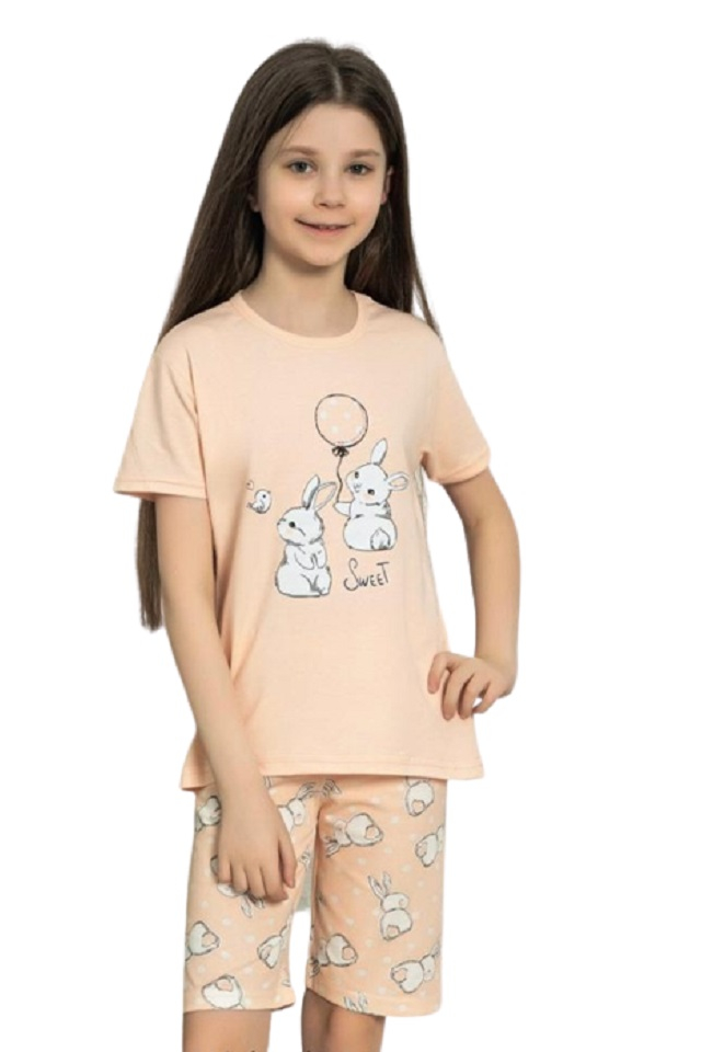 Pijamale copii, Maneci scurte si imprimeu iepurasi, Roz