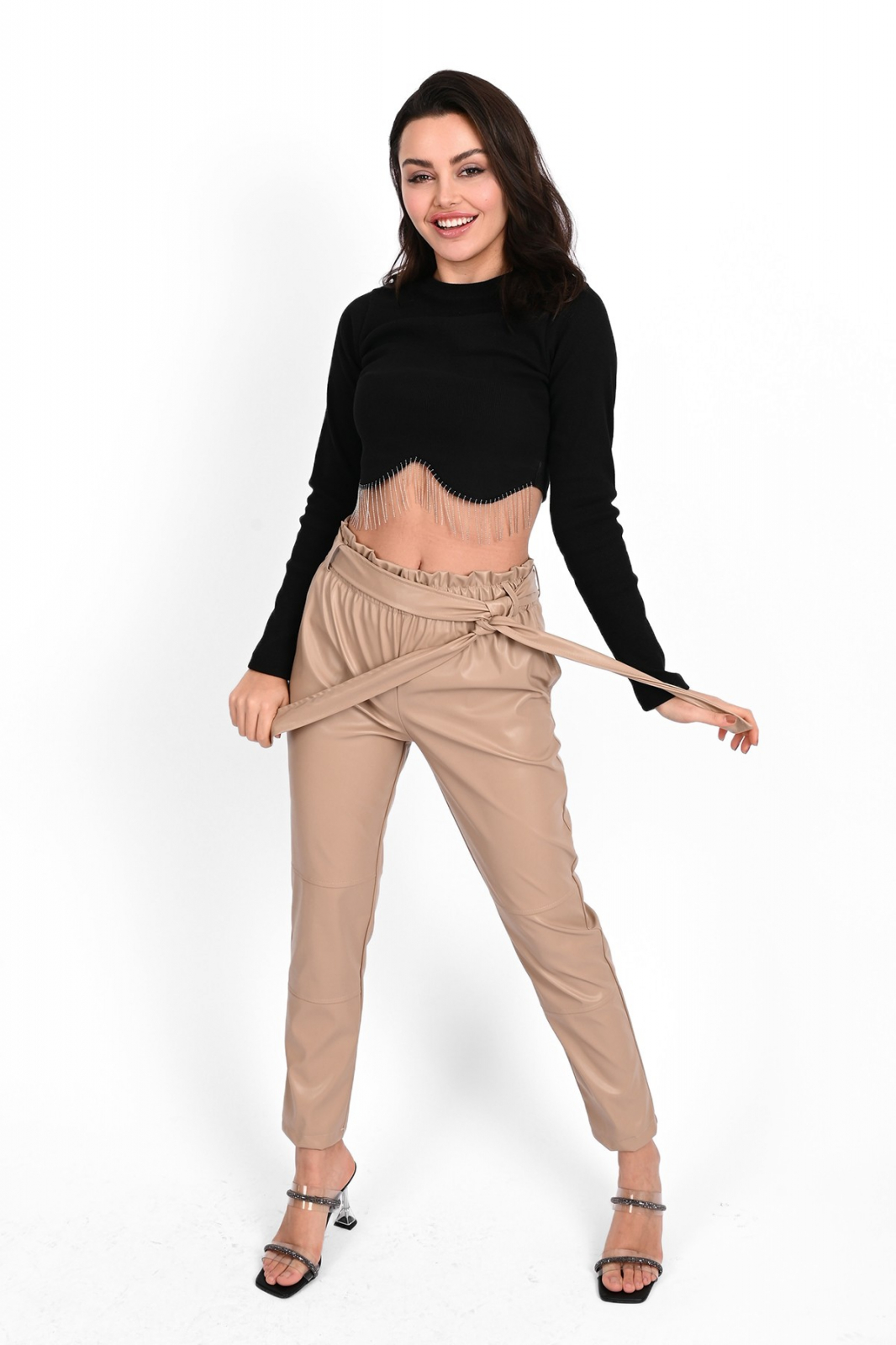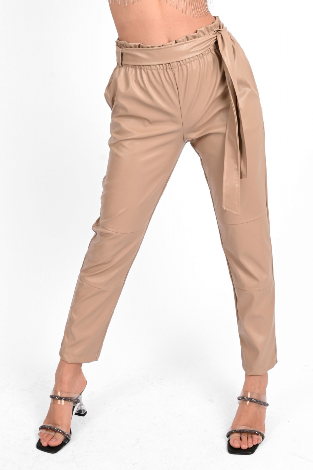 Talie: Inalta, echipata cu o banda elastica la brau si cordon, ofera o potrivire perfecta si confortabila. Material: Pielea ecologica de calitate adauga un aspect rafinat si este extrem de usor de intretinut.